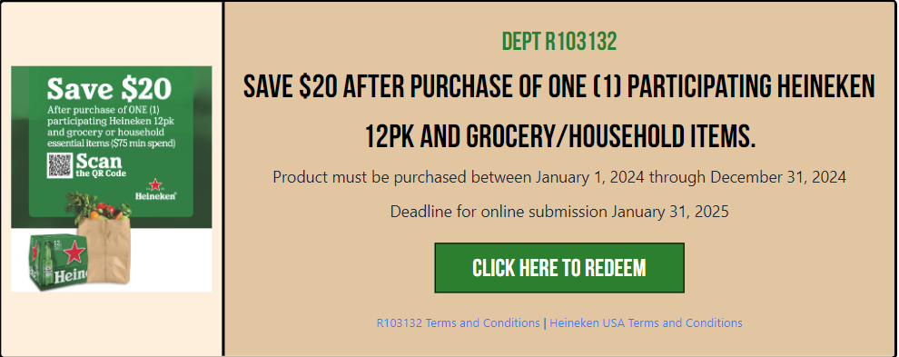 Save $20 after purchase of ONE participating 12-pk Heineken/Dos Equis/Tecate AND $75 grocery/household essential. Three