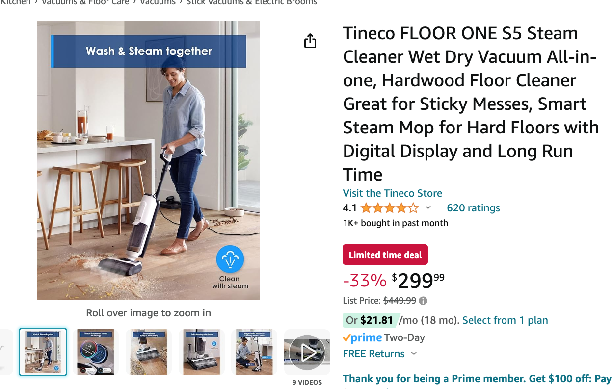 -33 Tineco FLOOR ONE S5 Steam Cleaner Wet Dry Vacuum All-in-one $299.99